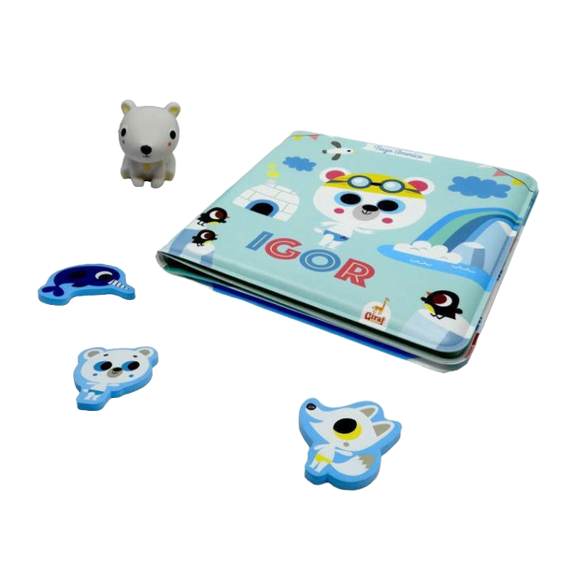 Igor de ijsbeer gaat zwemmen met zijn vriendjes! Dankzij de grote poster en figuurtjes in badstof kan je het verhaaltje zelf naspelen en wordt een bad nemen een echt avontuur! Een superleuk badboek, een grote poster die je in bad kan gebruiken, en een schattig speelpopje. De figuurtjes in badstof blijven kleven op de poster en aan de rand van het bad.
