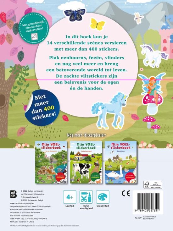 In dit boek kun je 14 verschillende scènes versieren met meer dan 400 stickers. Plak eenhoorns, feeën, vlinders en nog veel meer en breng een betoverende wereld tot leven. De zachte viltstickers zijn een belevenis voor de ogen én de handen.